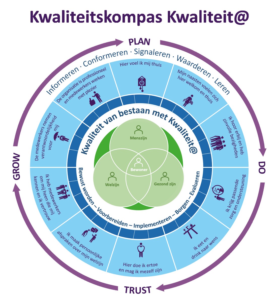 Het Kwaliteitskompas Kwaliteit@ brengt het gedachtegoed samen in één helder overzicht. In een oogopslag is zichtbaar hoe welzijn, mens zijn en gezond zijn verbonden zijn met de beloften en bouwstenen. De Plan, Do, Trust en Grow-cyclus ondersteunt het continue leren en ontwikkelen.